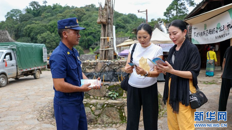 吴金良给游客发农村消防安全知识手册(8月12日摄)。新华网发 李浩 摄