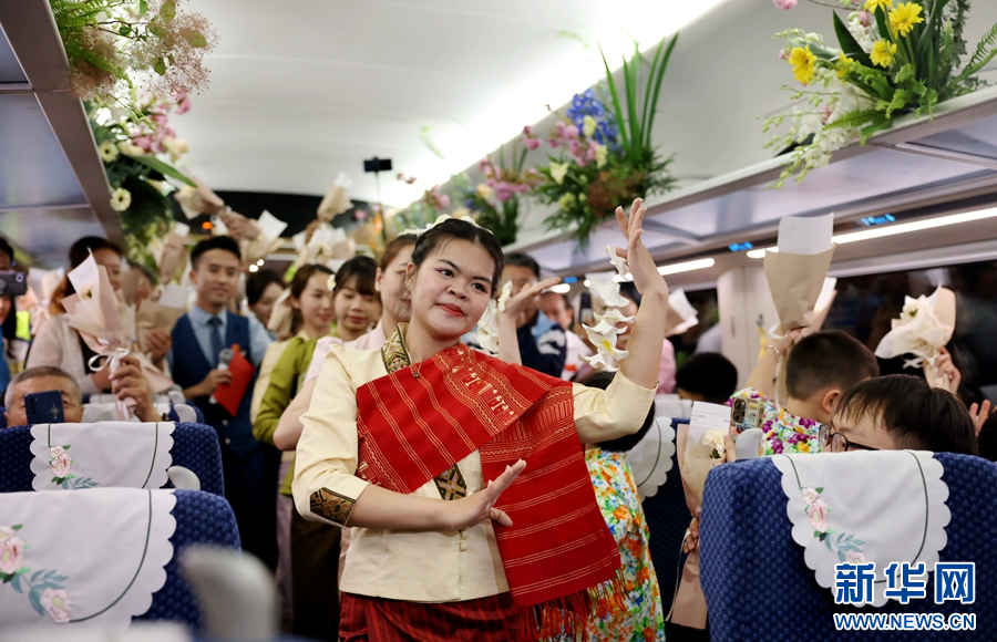 新华网昆明4月12日电(念新洪)4月12日,中老铁路国际旅客列车开行两周年。当天,昆明南至万象的中老铁路D87次国际旅客列车上欢声笑语,来自中国铁路昆明局集团有限公司的工作人员,与来自昆明铁道职业技术学院的老挝、泰国、越南等国留学生一起,为旅客们献上了一场“钢铁丝路好风光”主题联欢活动,欢庆中老铁路国际旅客列车开行两周年。