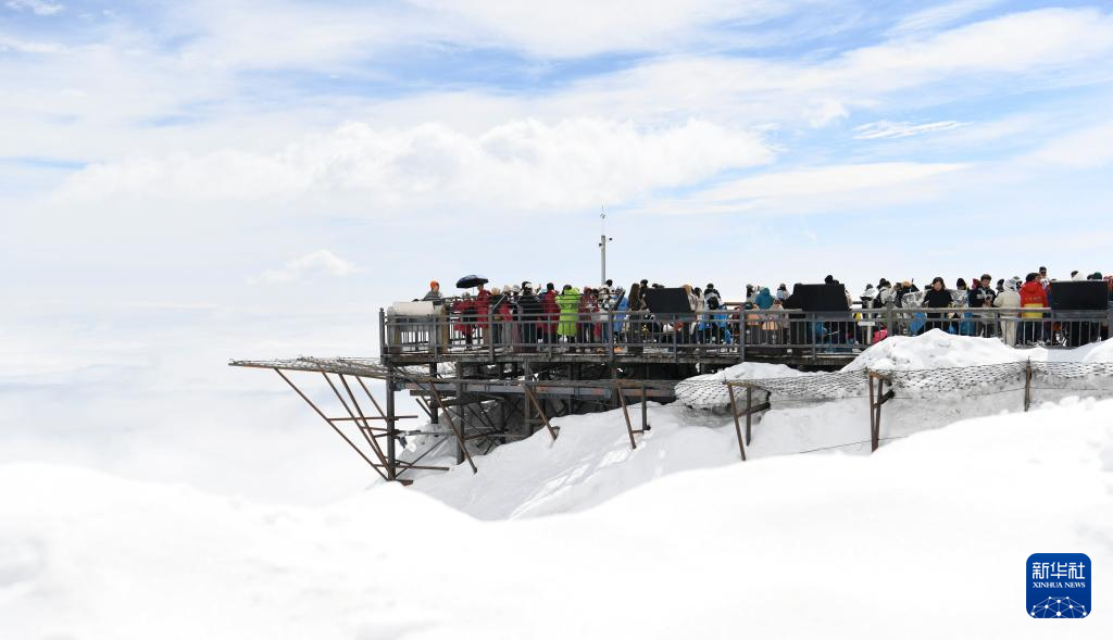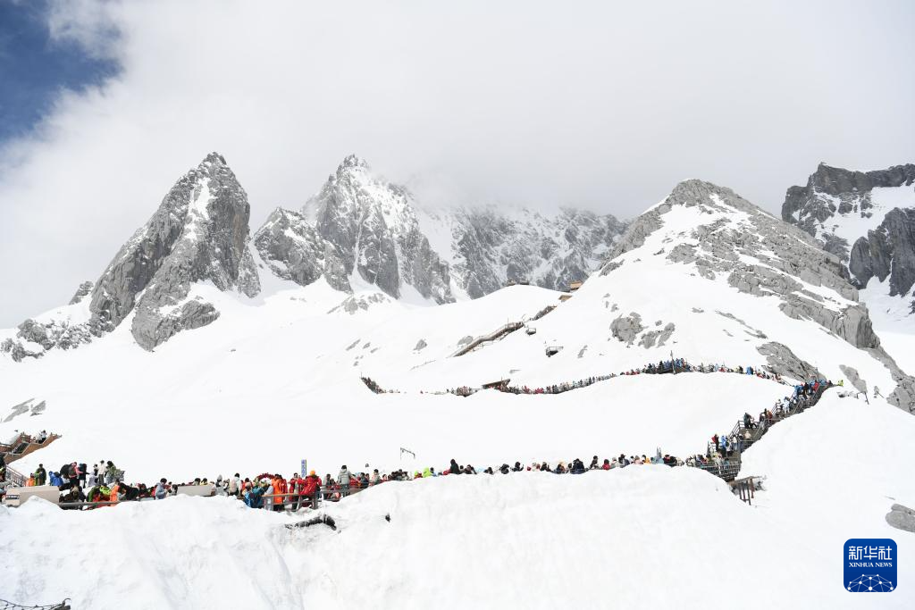 近日,云南丽江玉龙雪山春雪云海同框,景色壮美,吸引众多游客前来游玩。