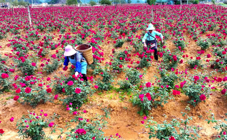 花农采摘玫瑰花(4月20日摄)。新华网发(丘北县融媒体中心 供图)
