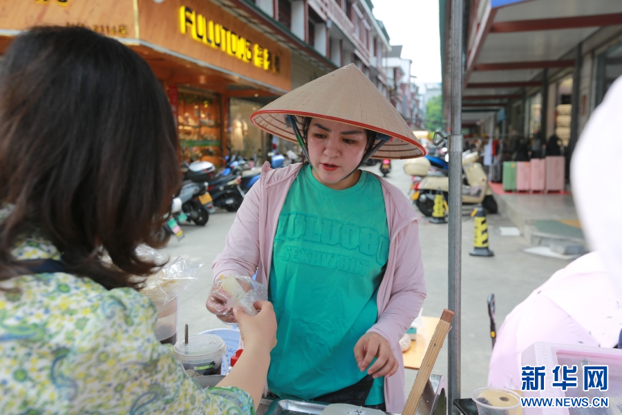 在云南省红河州河口县,越南商贩正在制作越南小卷粉(5月2日摄)。新华网发(薛莹莹 摄)