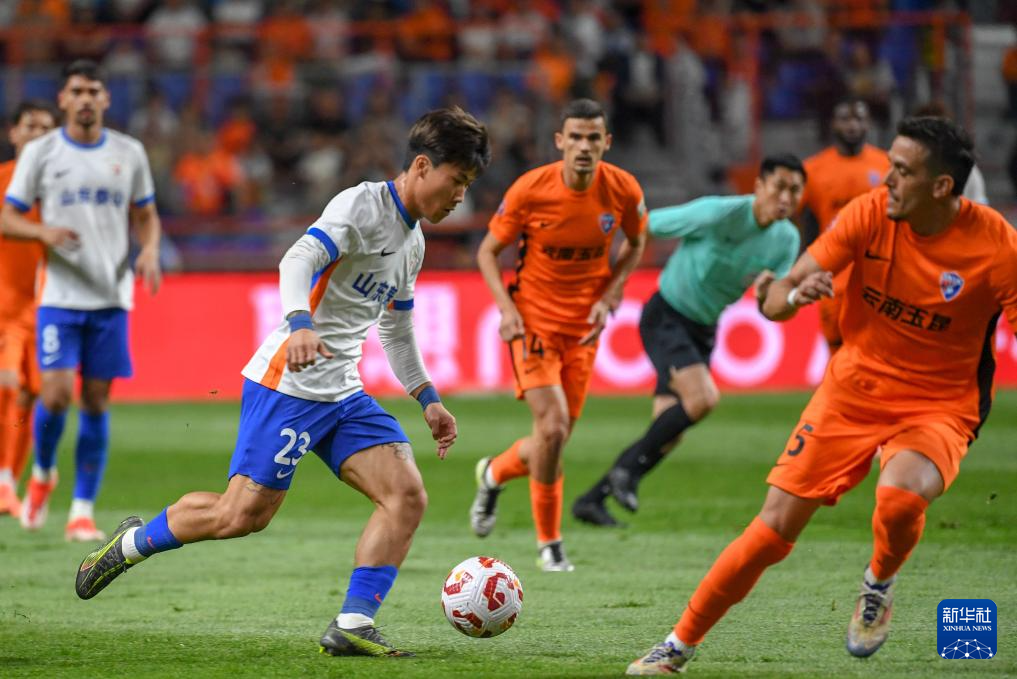 5月5日,山东泰山队球员卡扎伊什维利(左)在比赛中与云南玉昆队球员张宸梁拼抢。新华社发(彭奕凯 摄)