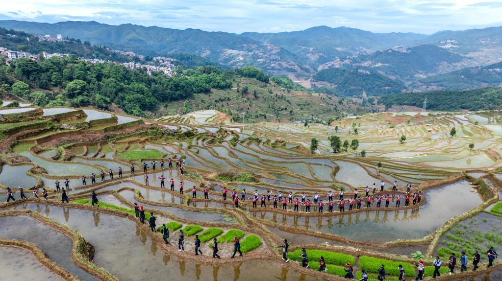 5月5日,云南玉昆队球员弋腾(中)在比赛中争顶。新华社发(彭奕凯 摄)