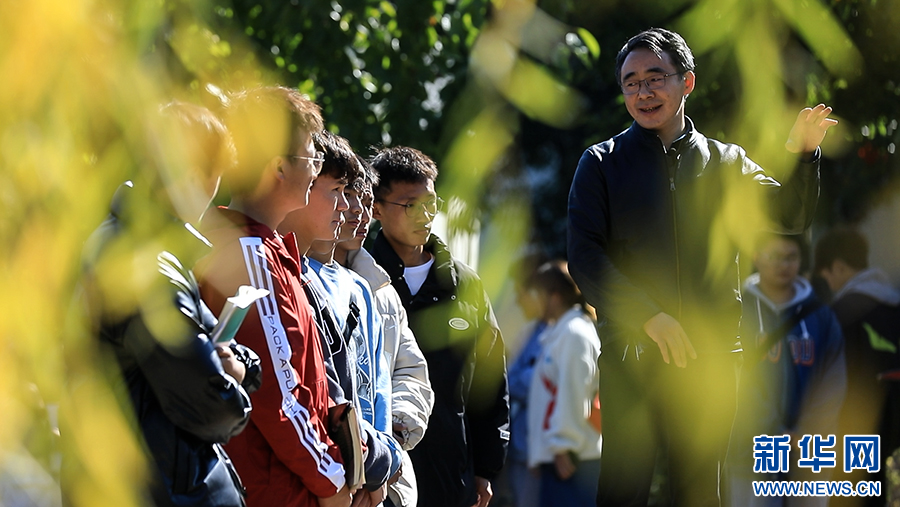 校园内,老师带领学生在大坝旁学习理论课(2022年11月24日摄)。新华网发(徐华陵 摄)