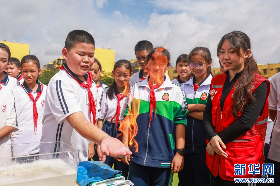 在云南省开远市东城小学“六一玩转科技 童心趣闯未来”主题活动中,五年级学生体验“火焰掌”丁烷肥皂气泡在手中燃烧(5月30日摄)。新华网发(陶家淇 摄)
