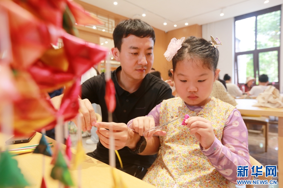 恰逢“六一”遇上端午节假期,云南省蒙自市红河书院开展“菱角织夏 艾草寄情”端午民俗亲子手作课(5月31日摄)。新华网发(薛莹莹 摄)