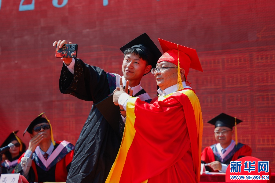 毕业生和校长花式合影(6月12日摄)。新华网发(宋瑞成 摄)