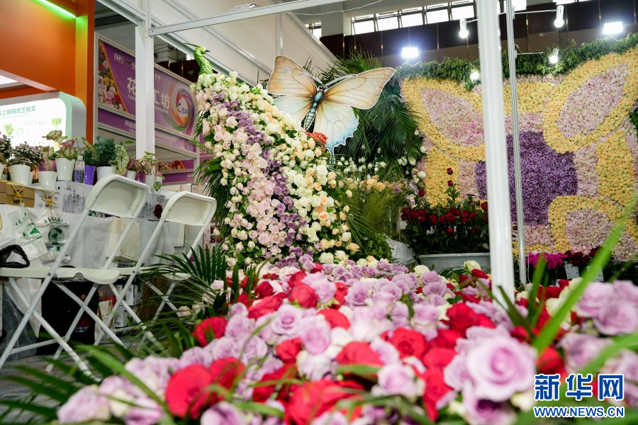 展台内的花卉装置(6月20日摄)。新华网发(周润元 摄)