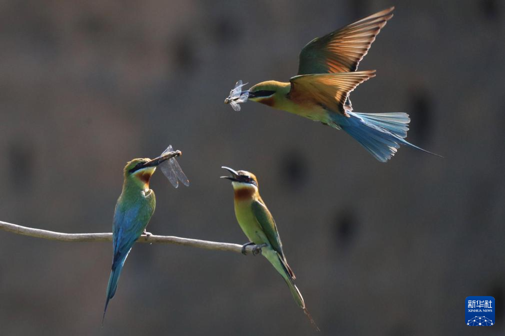6月23日,栗喉蜂虎正在觅食嬉戏。新华网发(张广玉 摄)