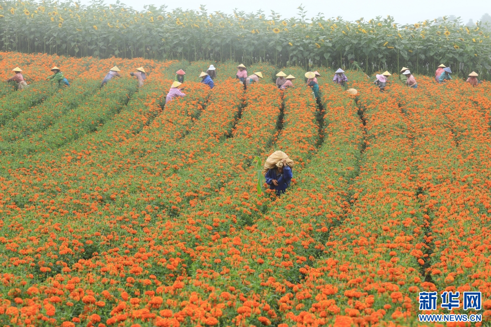 8月5日,在云南省曲靖市陆良县活水乡雨麦红村,花农正忙着采收万寿菊。新华网发 (王勇 摄)