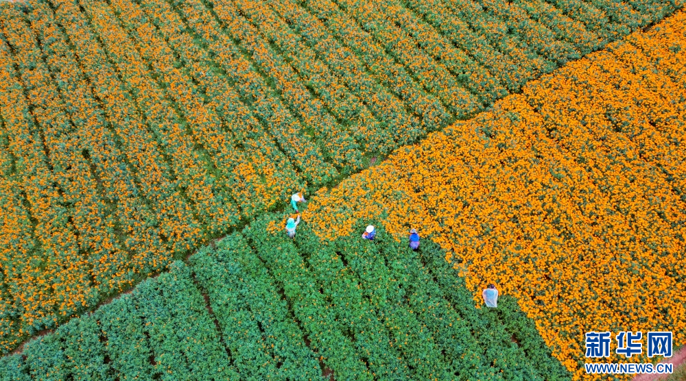 8月7日,在云南省腾冲市固东镇,花农采摘万寿菊(无人机照片)。新华网发(龚祖金 摄)