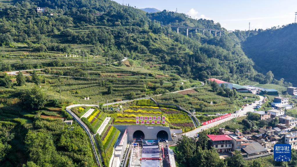 空中俯瞰渝昆高铁炳辉隧道洞口(8月19日摄,无人机照片)。新华社记者 胡超 摄