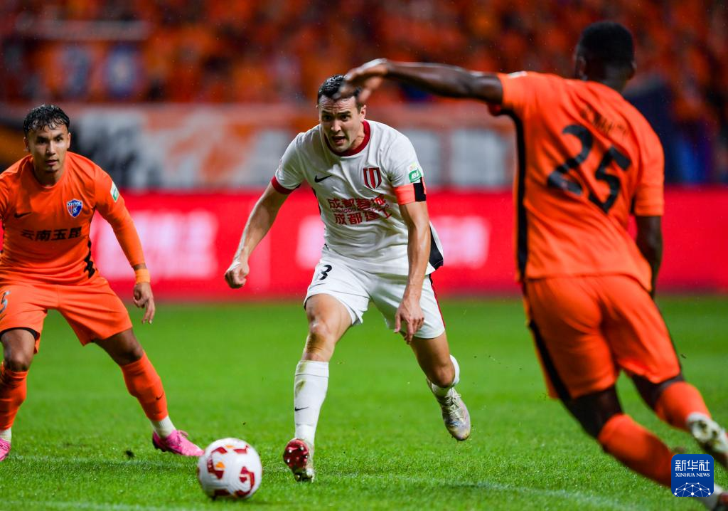 8月23日,成都蓉城队球员杨明洋(中)与云南玉昆队球员奥斯卡(左)在比赛中拼抢。新华社记者 陈欣波 摄
