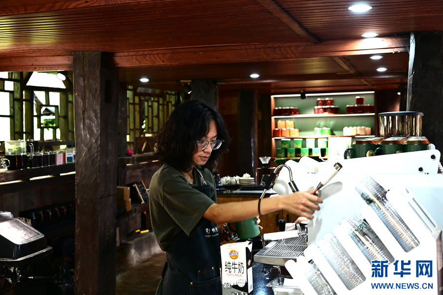 在野鸭塘河谷·景迈山店,工作人员正在冲泡咖啡(8月26日摄)。新华网发(刘起 摄)