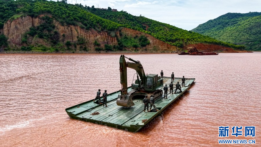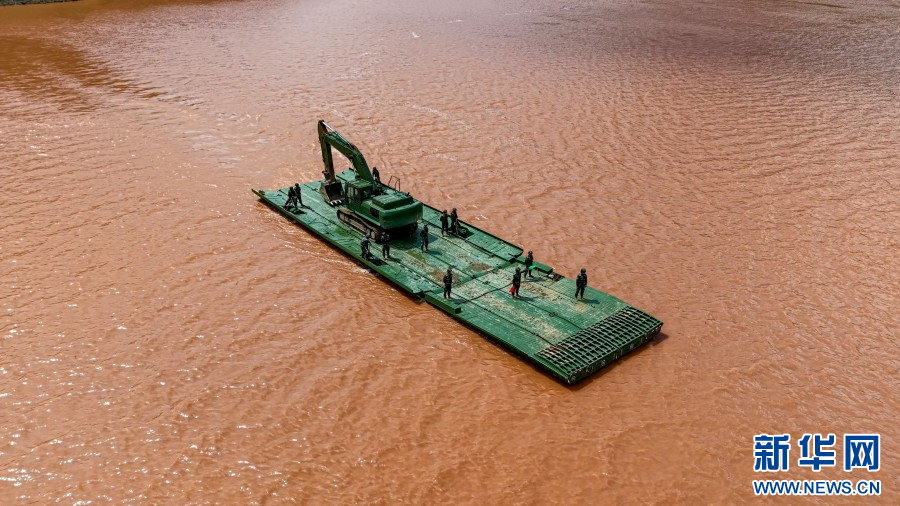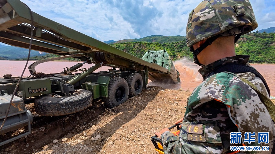 动力舟桥卸载(视频截图)。新华网发(武警第二机动总队某支队供图)