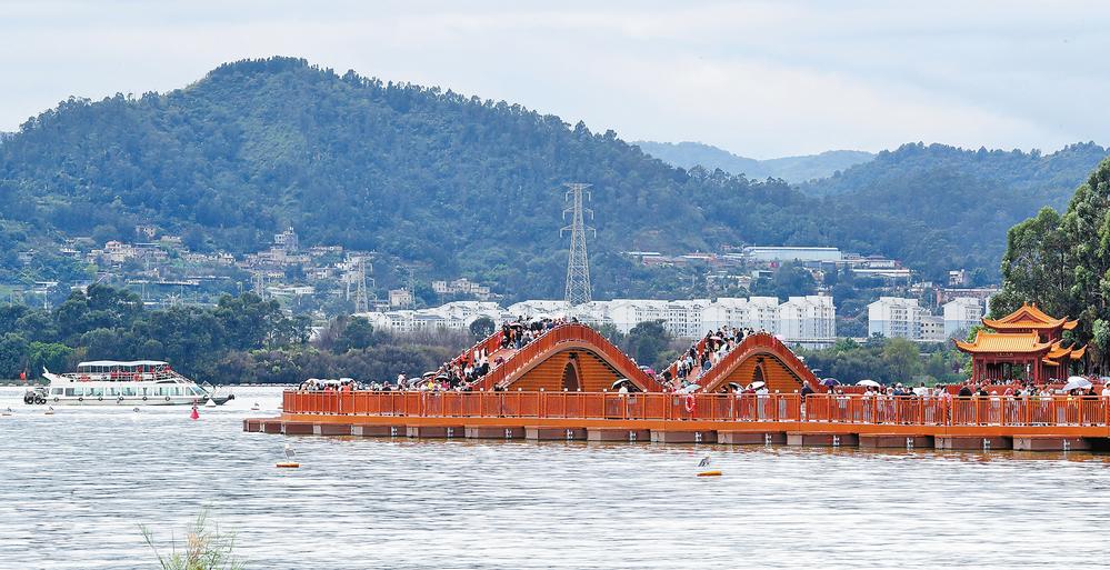 国庆中秋假期,昆明滇池绿道草海开合浮桥每日有上万人前来争睹514米长的“水上长虹”。 记者 杨峥 摄