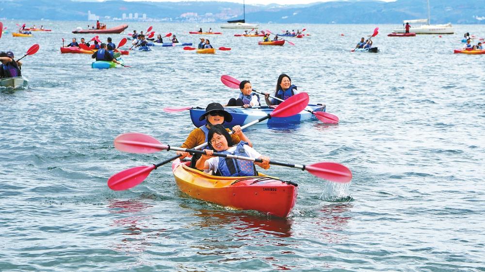 游客在抚仙湖体验皮划艇项目。 通讯员 高嘉蓉 摄