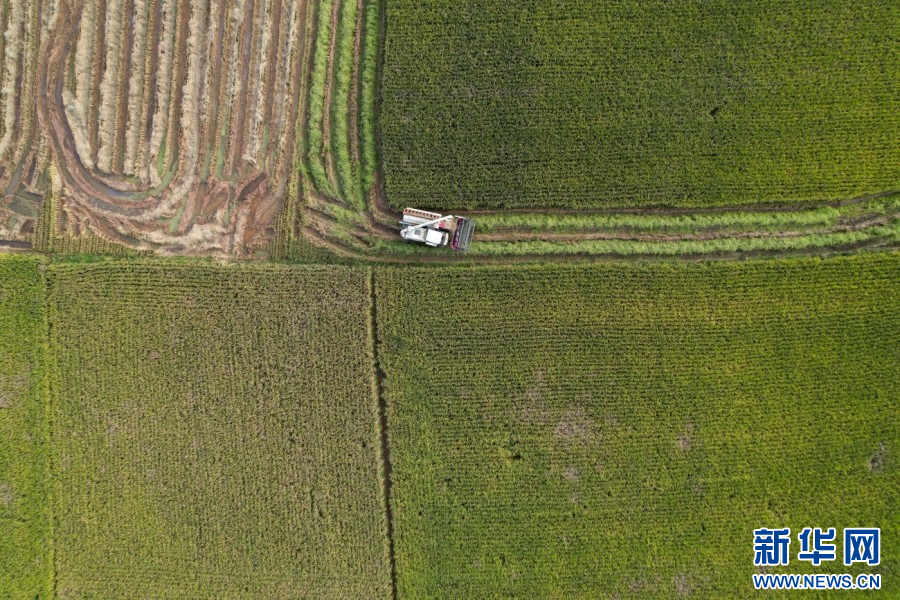 航拍云南省曲靖市麒麟区越州镇舟上村收割水稻(10月12日摄)。新华网发(杨俊鹏 摄)